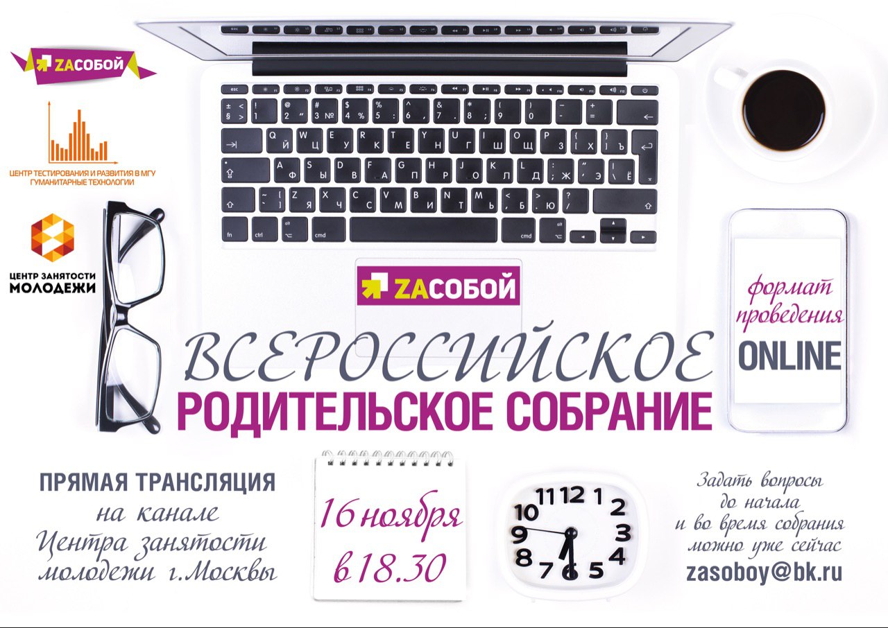 Уважаемый участник программы «Zасобой»! 16 ноября 2017 года в 18.30 часов по московскому времени состоится Всероссийское родительское собрание «Zасобой». К участию приглашаются родители (законные представители), преподаватели и специалисты, курирующие профориентационную работу в школах. Ведущие эксперты в области профориентации, образования и занятости в формате online расскажут Вам о том, как помочь ребенку выбрать дальнейшее образование и профессию, какие специальности востребованы сегодня на рынке труда. Также планируется обсуждение результатов «Всероссийской профдиагностики– 2017». Организаторами родительского собрания являются Всероссийская программа по развитию системы ранней профориентации «Zасобой» совместно с Центром тестирования и развития «Гуманитарные технологии» при МГУ. Мероприятие состоится в формате «online», благодаря чему Вы сможете во время прямого эфира задать интересующие Вас вопросы, отправив сообщение на электронный адрес zasoboy@bk.ru. Для участия в родительском собрании необходимо 16 ноября т.г. в 18:30 часов по московскому времени включить прямую трансляцию на канале Центра занятости молодежи Москвы